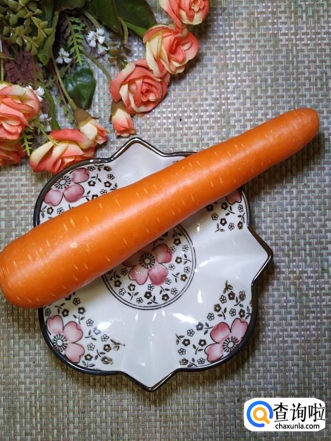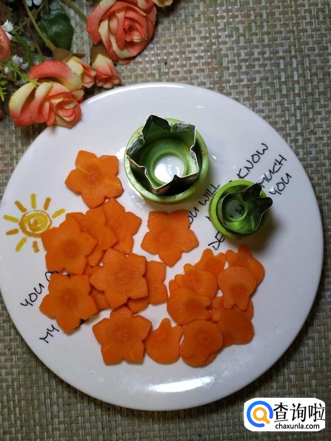 准备一个胡萝卜,洗净后,切成片,用模具刻出花形和小兔子的形状,放入盘中备用。