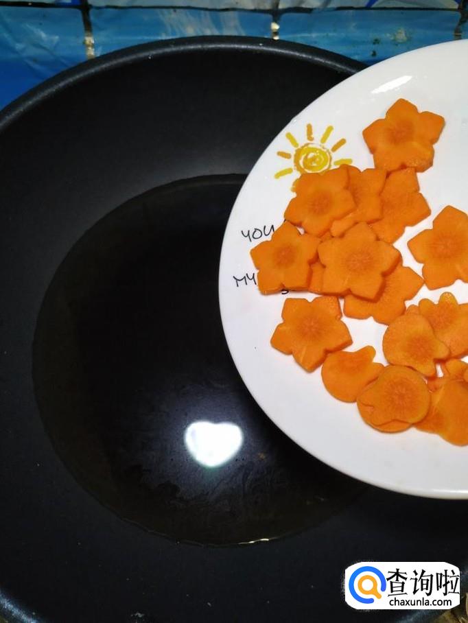 锅中放入适量清水,然后将刻好的胡萝卜放入锅中。