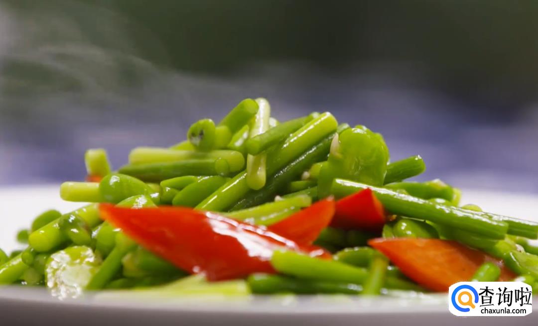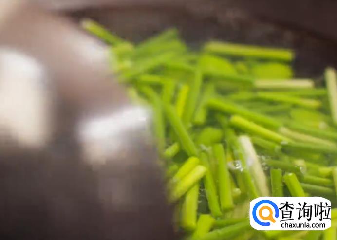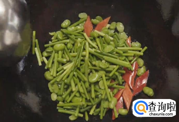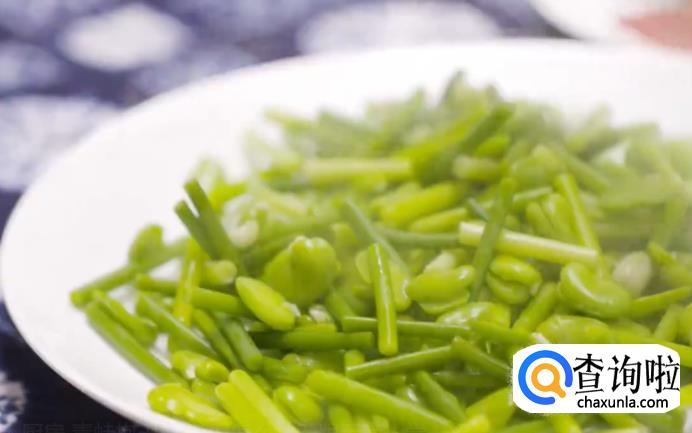 如果豆米比较嫩,就可以和蒜芯一起过水;如果豆米比较老的话,豆米要先过水,煮软了之后再加入蒜芯过水。