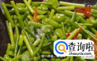 热锅起油,待油冒烟,下甜椒炒一下,再倒入豆米和蒜芯,翻炒均匀;加一点盐、糖调味;出锅前淋少许水淀粉勾芡;这样脆嫩的青蛙抱玉柱就做好了。