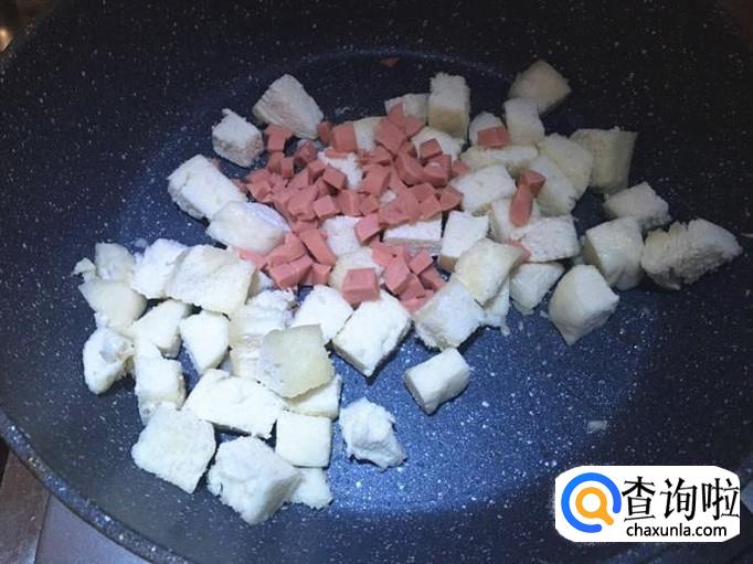 锅中倒入适量油,油热放入馒头丁翻炒至金黄色