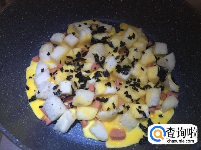 均匀的倒入蛋液,确保每一块馒头都蘸到蛋液,撒上海苔碎,慢火煎至表面蛋液凝固,一定要慢火,否则底部容易焦