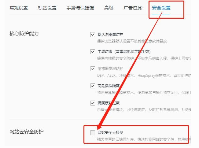 2、切换到安全设置,然后把网站安全云检测关闭即可。下次再打开就可以正常访问了。
