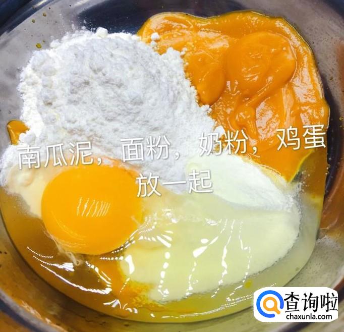 然后加南瓜泥、面粉、奶粉和鸡蛋一起放入一个比较大的容器当中,如下图所示。