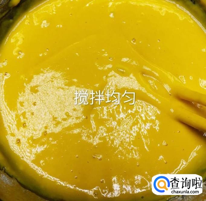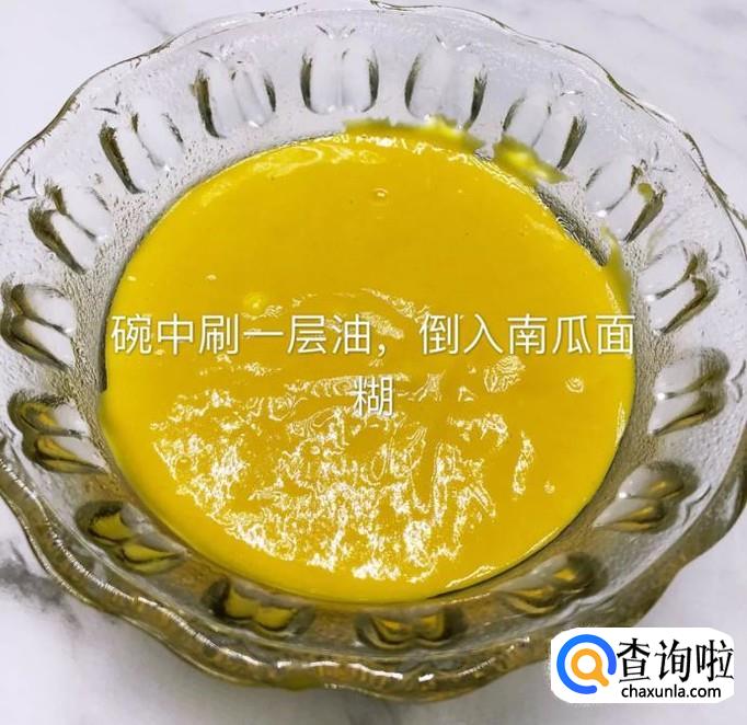 然后在一个碗中刷上一层油,倒入南瓜面糊,如下图所示。