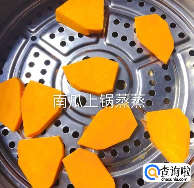 然后将南瓜切成薄片,上锅蒸熟,如下图所示。