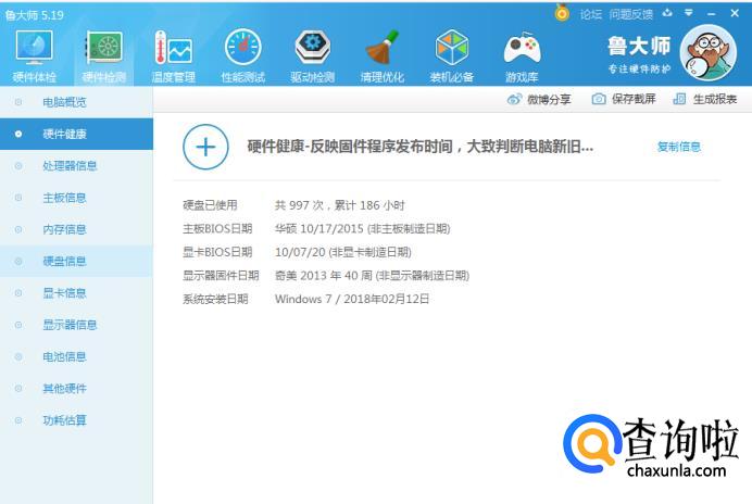 打开鲁大师,点击硬件检测。就会出现许多电脑硬件有关的信息,可以看一下各种配件的生产时间。