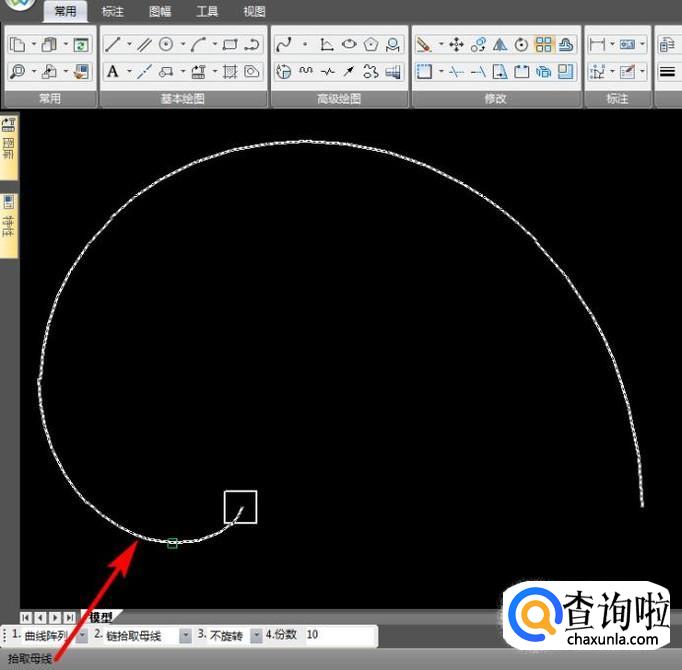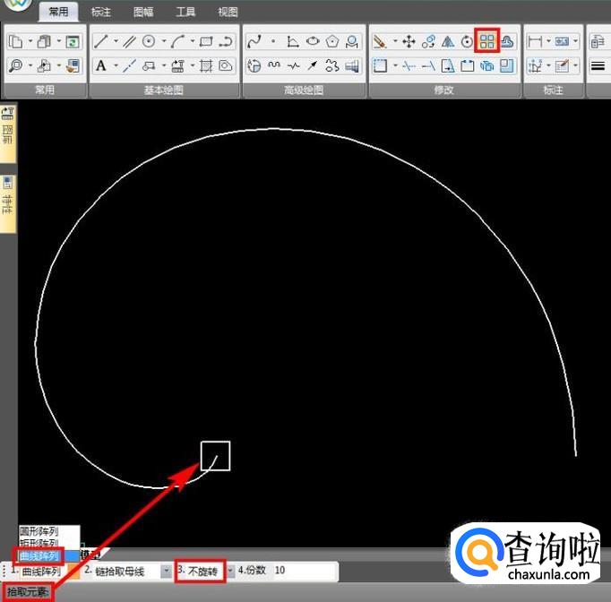 点击阵列命令,左下方第1个选项选择“曲线阵列”,第3项选择“不旋转”,份数10份,该命令第1步拾取元素,即选择要阵列的图形,选择结束,右键确认;