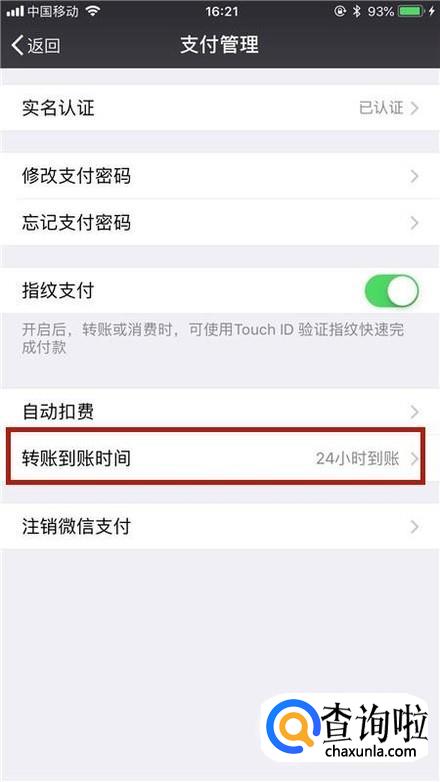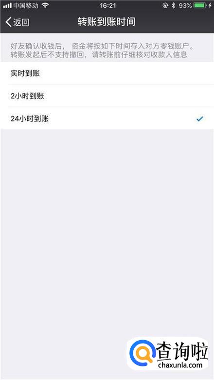 然后点击转账到账时间,把到账时间设置为24小时到账。这样设置完成,即便我们把资金转错了,也是能够把资金找回来的。