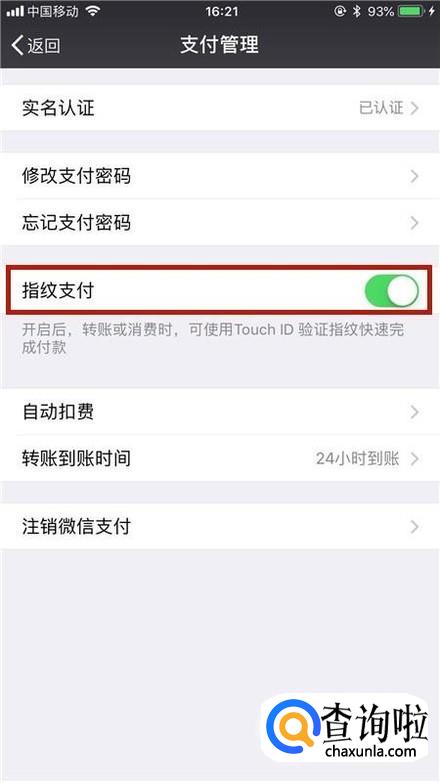 接着点击开启指纹支付开关,如下图所示。这样如果不是你本人,即使对方知道你的支付密码也是无法完成支付动作的。