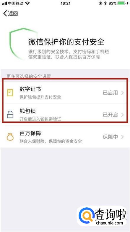 接着点击支付安全,如下图所示。在这里你可以开启数字证书和钱包锁的功能,这两个功能能够大大提升我们QQ钱包的安全系数。