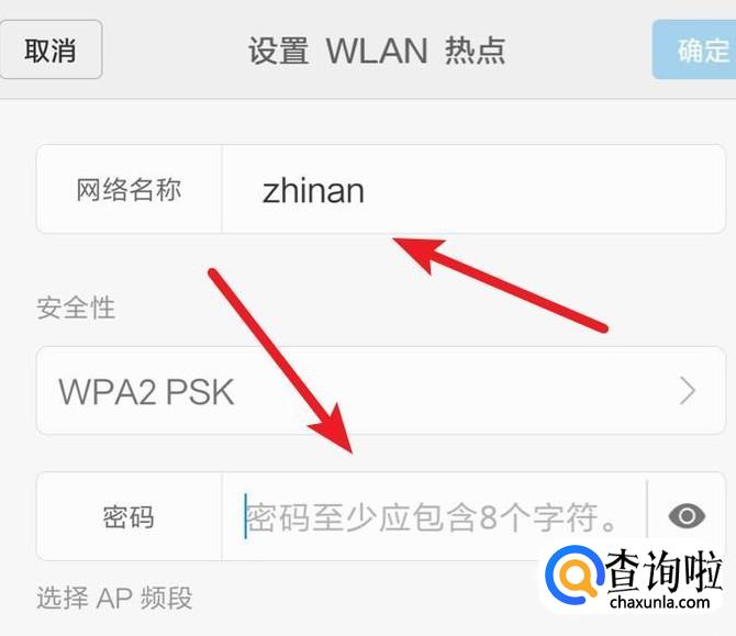 来到热点的设置页面,在这里我们输入热点的名称,和密码就可以了,他人就可以通过这个名称找到你的热点,输入密码就能连接使用了。