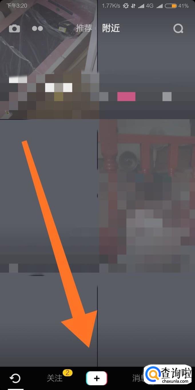 首先进入抖音主页,点击屏幕下方的“+”号。