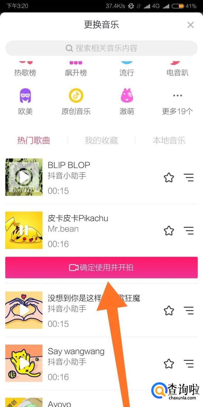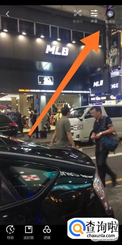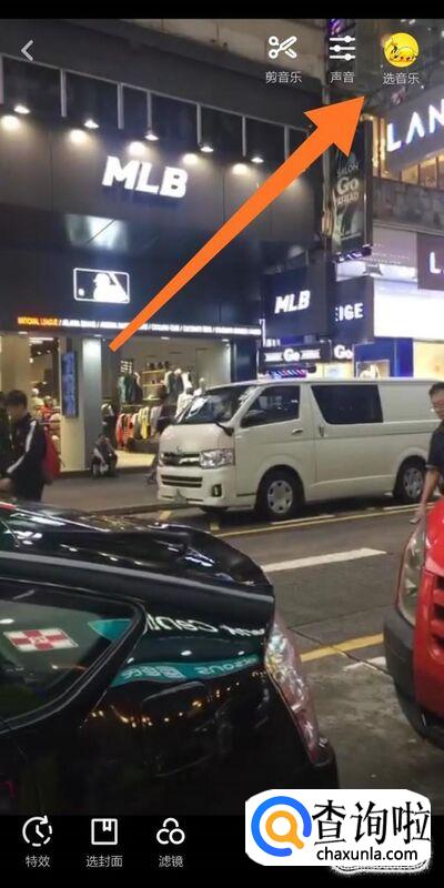 点击屏幕右上角“选音乐”。选好音乐后,再点击音乐下方的“确定使用并开拍”即可把音乐添加到视频。