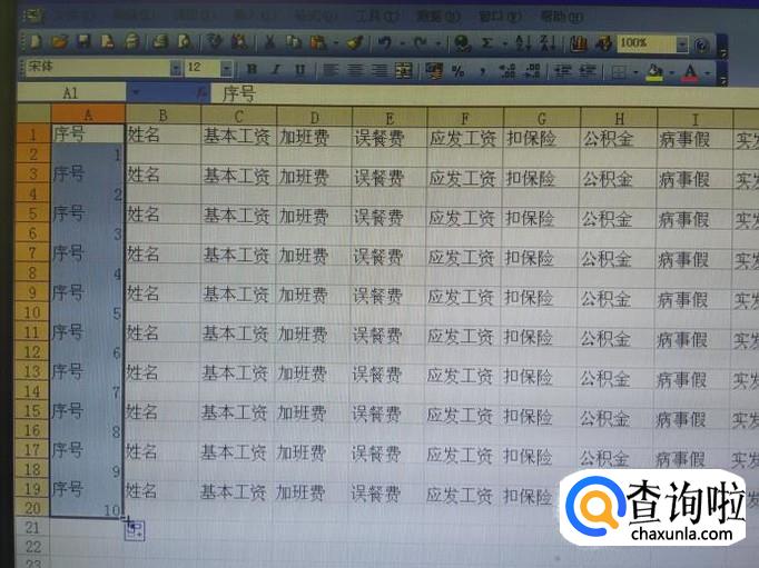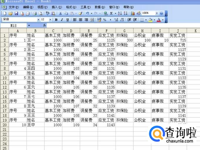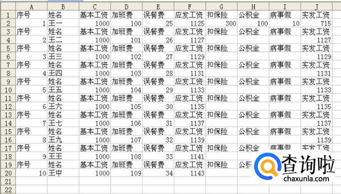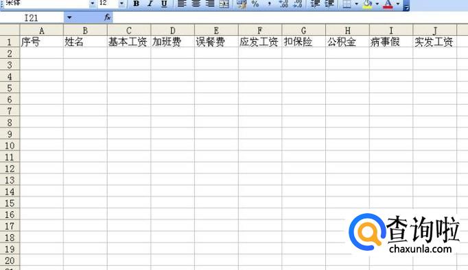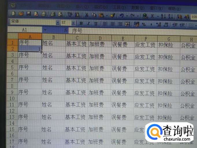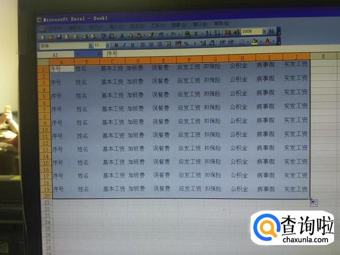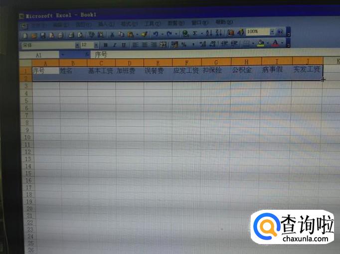 打开一个EXCEL空白表,在第一行分别输入序号、姓名、加班费、误餐费、应发工资、扣保险、公积金、实发工资等项目,具体可以根据自己公司的需要来写。