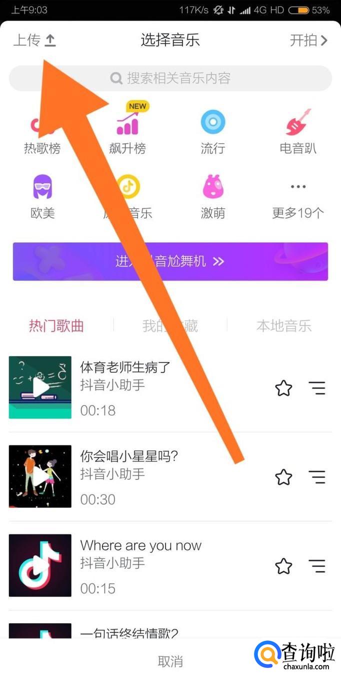 接下来我们进入抖音,点击屏幕左上角的上传图标。