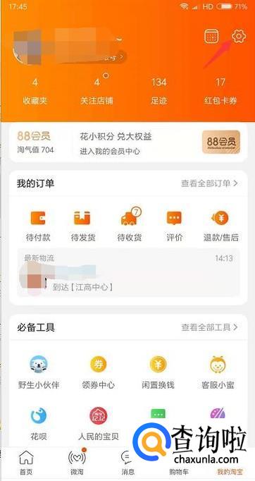 首先我们登录淘宝后,在我的页面里点击右上角的设置图标。
