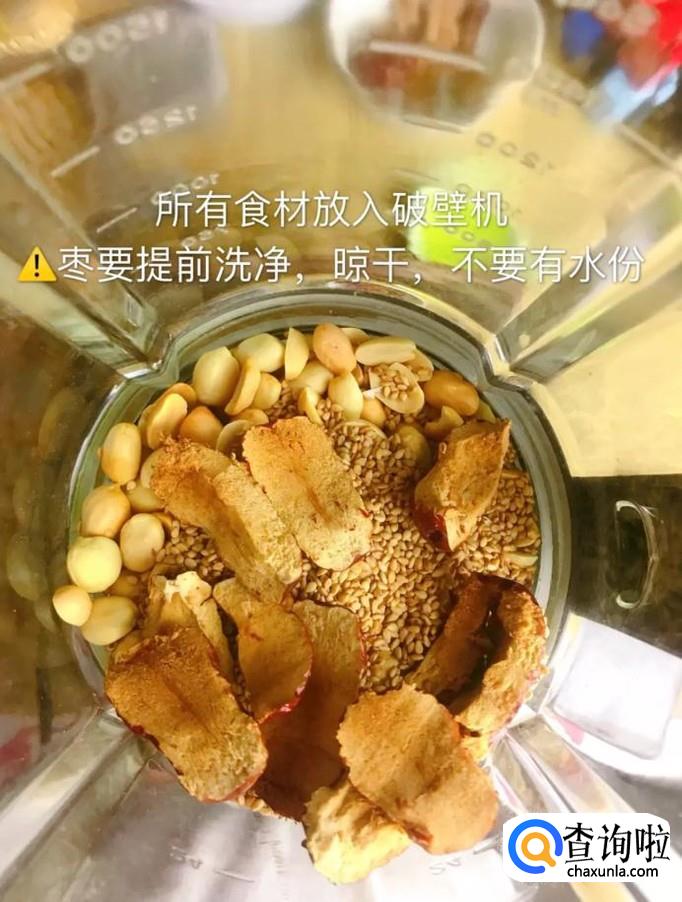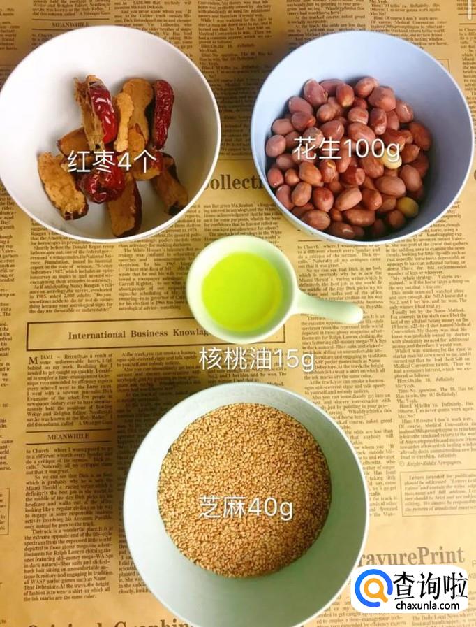 首先准备好所有要用到的食材,如下图所示。小贴士:红枣4个,花生100克,核桃油15克,芝麻40克。