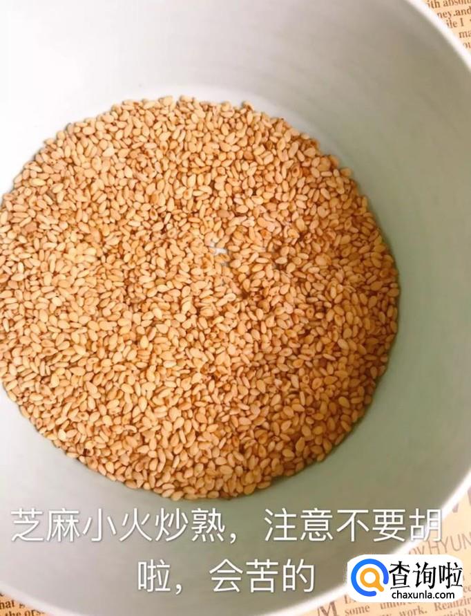 然后把芝麻倒入不粘锅,开小火炒熟,如图所示。小贴士:这个动作一定要开小火,不然芝麻炒糊了是会苦的。