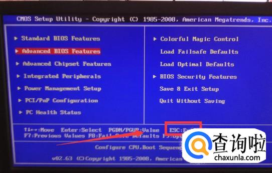 当我们设置完成后就可以按ESC键退到设置主页面,按下键选择“exit”退出,等待电脑重启就可以了。