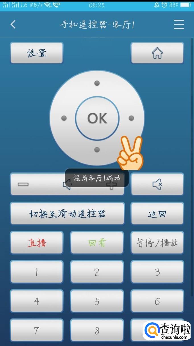 此时屏幕右边会出现我们刚才选择的电视位置”客厅1“,轻轻点击后,就投屏成功啦!
