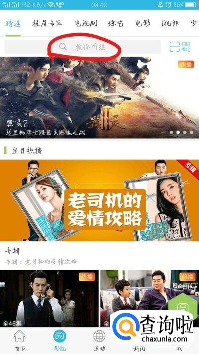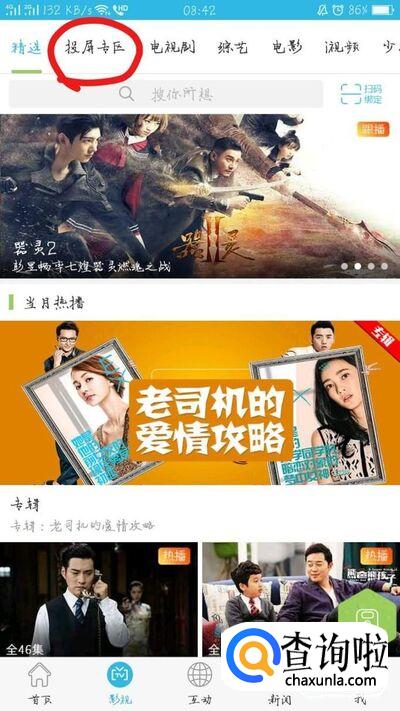 手机客户端登陆后,点击”影视“中的”投屏专区“,或者在搜索栏中”搜你所想“