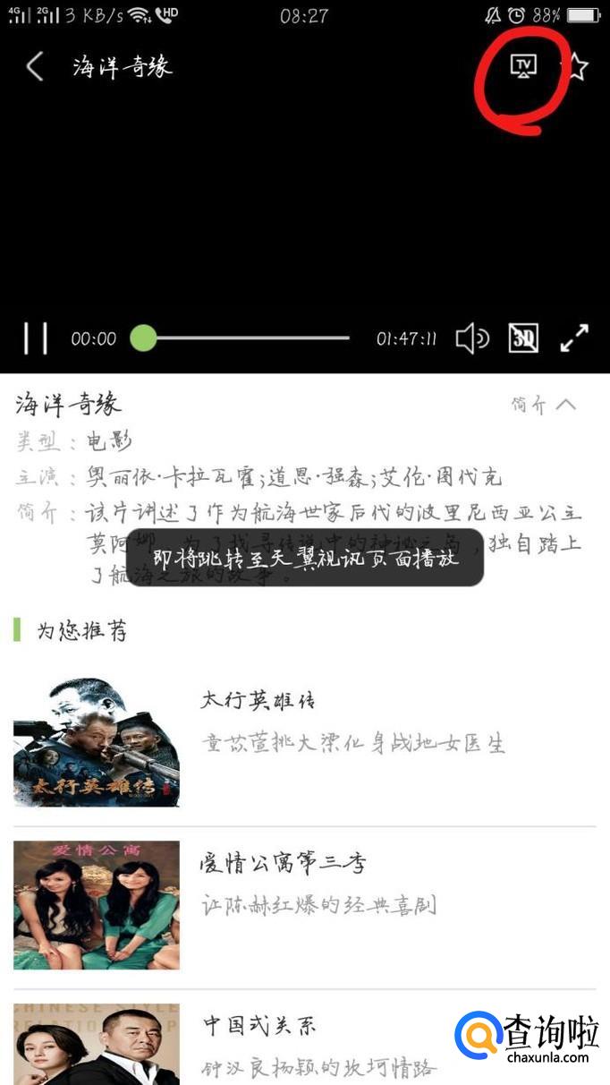 选择好影片后,点击”播放“,轻点屏幕右上角有个”TV“标志