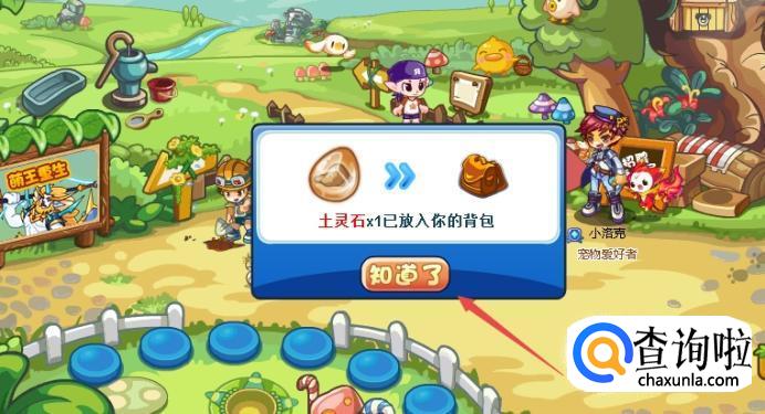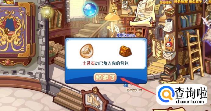 点击之后,系统就会自动提示你已经得到了“土灵石”,点击“知道了”就可以了。