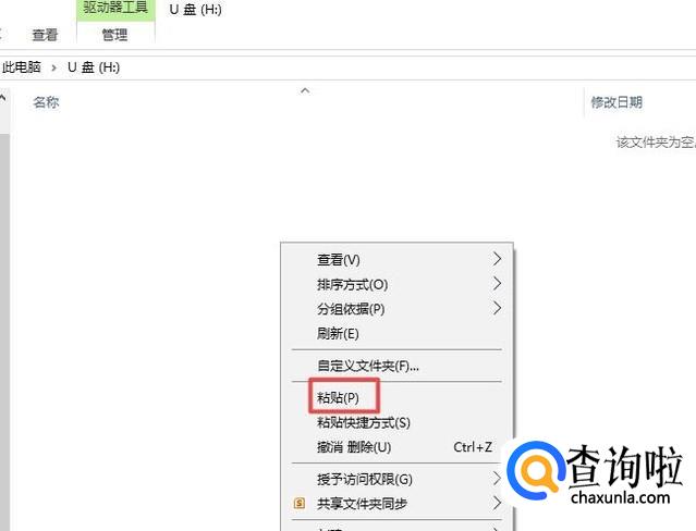 之后我们回到我们之前打开的U盘处,然后右击选择粘贴;