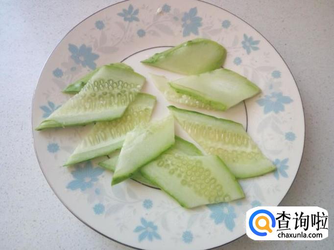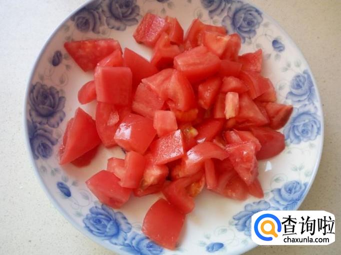 西红柿用水洗净,切成小块。黄瓜用水洗净,切成薄片。