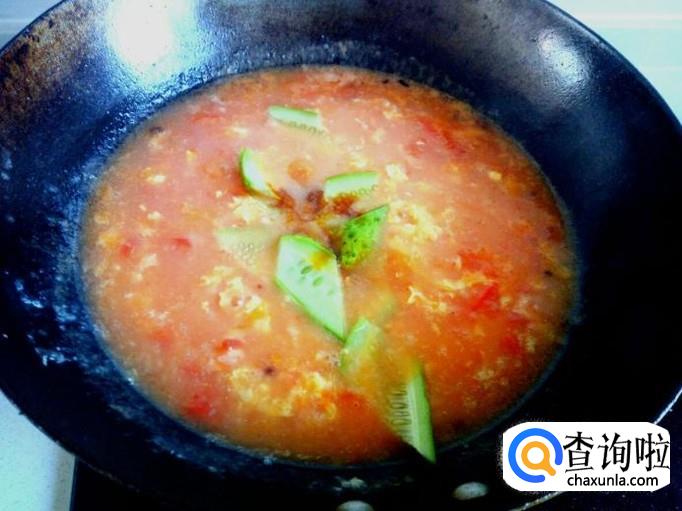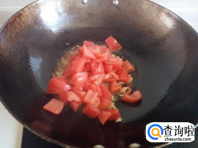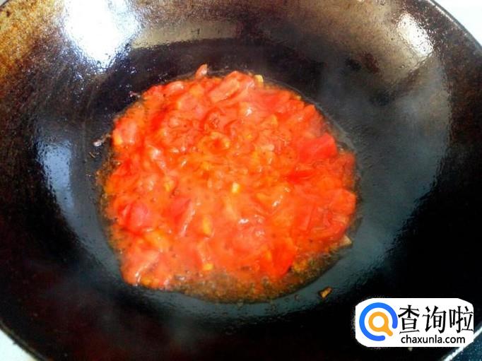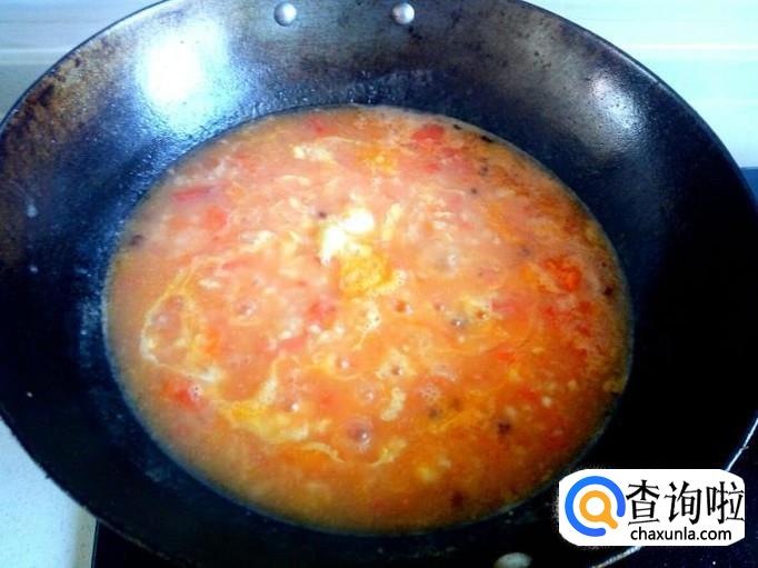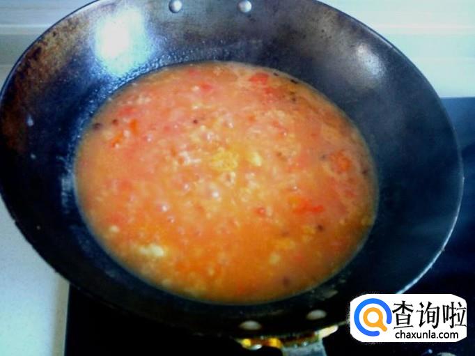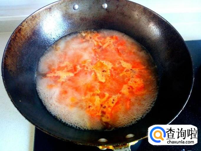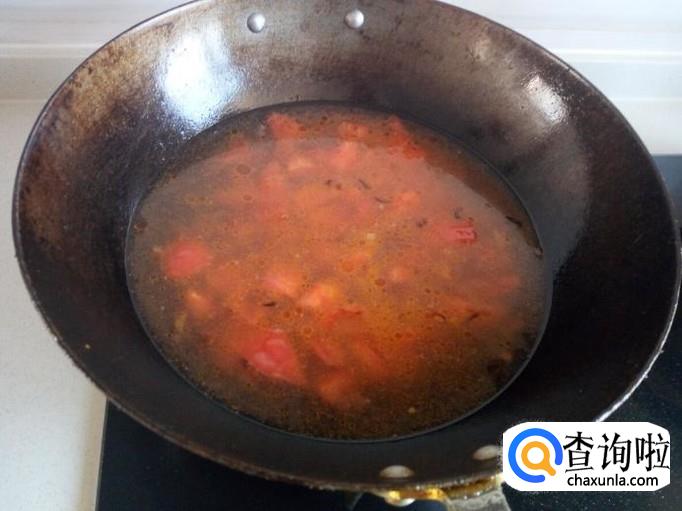 炒至西红柿变软下红汤后,放入清水,烧开,放入适当的盐。