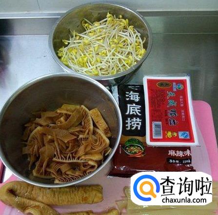 食材:鸭血、毛肚、肥肠(熟)、火腿、豆芽、粉丝(根据个人爱好还可以自行添加食材)
