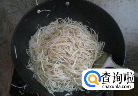 一切准备就绪之后,将锅擦干净,倒入少量食用油,油烧热之后倒入豆芽菜,不断翻炒,等豆芽菜翻炒出香味之后,即可出锅。