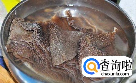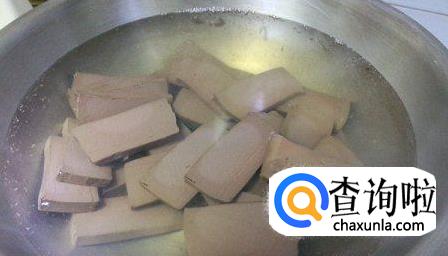 将锅中倒入清水烧热,倒入毛肚,放入少量食盐,大概1分钟即可出锅,再将鸭血也放入锅中,当鸭血外表微微发白之后,即可捞起备用。