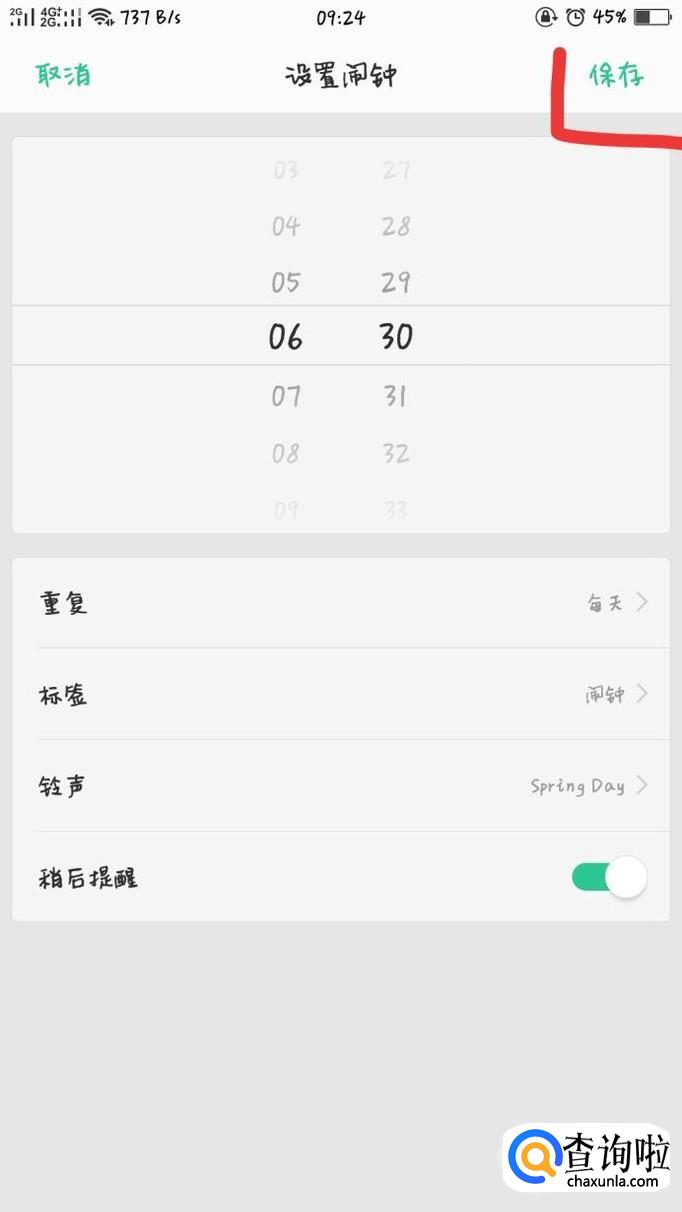 设置好闹钟的时间、重复频率和闹钟铃声后,点击右上方保存即可。