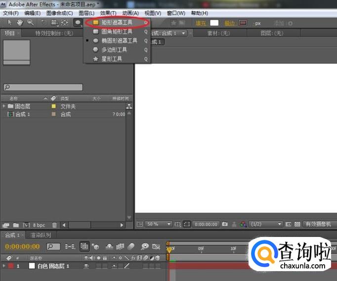 选择固态层,在合成窗口空白区域,绘制一个长方形矩形遮罩。