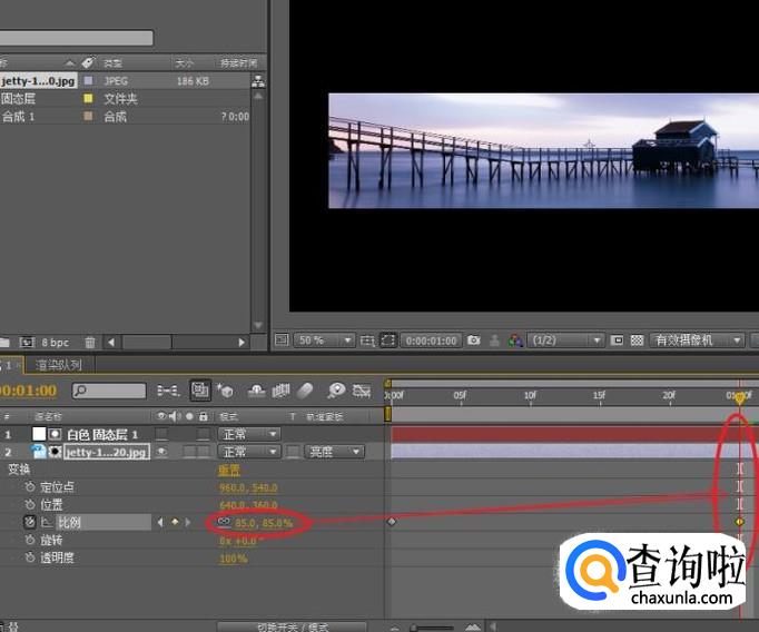 拖拽时间线指针到第一秒,调整比例属性为:85%。