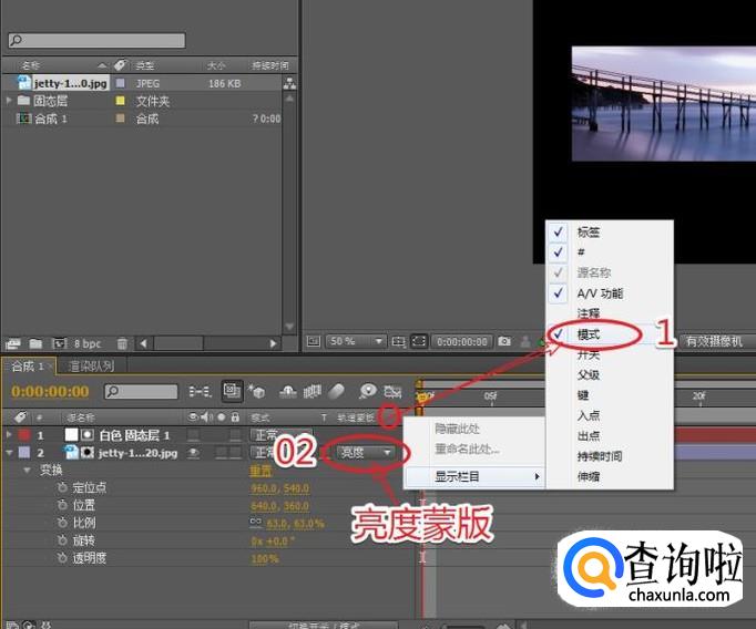 在图层面板空白区域,右击鼠标依次选择“显示栏目>模式”命令,将轨道蒙版模式设为:亮度蒙版。