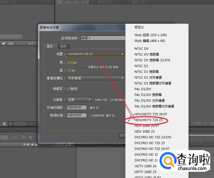 将预置设为:HDV/HDTV 720,持续时间设为:3秒,单击确定建立新合成。