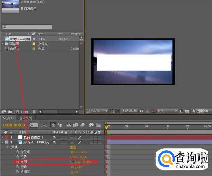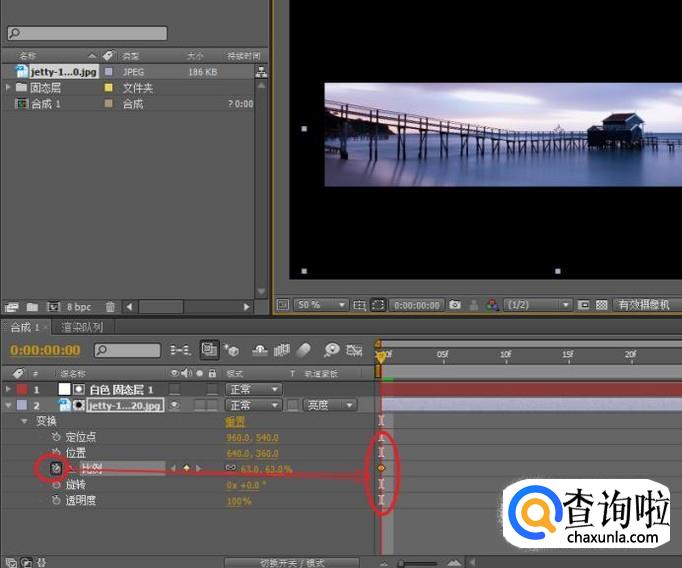移动时间线指针到第一帧,展开变换属性为“比例”属性添加关键帧。