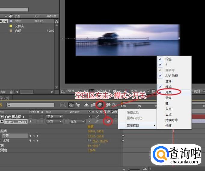 在图层栏目空白区域,右击鼠标选择“显示栏目>开关”调取开关选项,开启图层的运动模糊,再次打开图层总运动模糊开关,完成最终效果。
