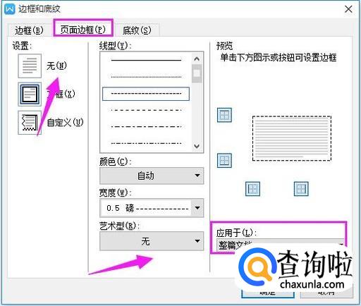 接着页面添加的话,同样的在刚刚那个页面,我们点击“页面边框”,应用于“整篇文档”,如图。