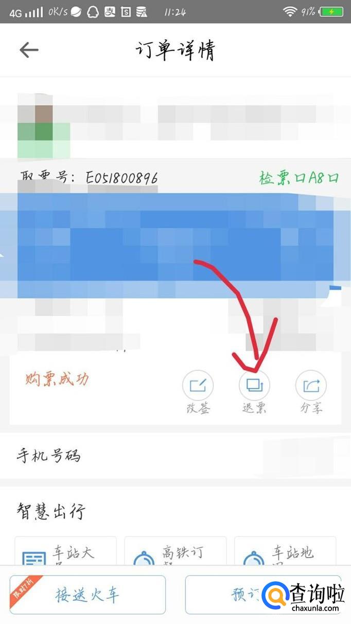 点击你购买的火车票,如图1箭头所示。会出现一个新的界面,如图2所示。点击“退票”选项,如图3箭头所示。这样就可以把票退掉了。