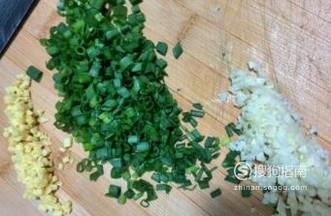 准备配料,将小葱洗净切碎,大蒜扒皮切碎,老姜切碎,嫩姜姜味不够浓烈,所以这里要用老姜。