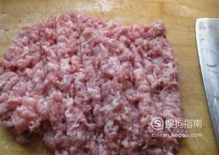 肉馅要肥瘦均匀才好吃,所以这里用的猪五花肉。将买来的猪五花肉剔去猪皮,用菜刀剁成肉馅备用。