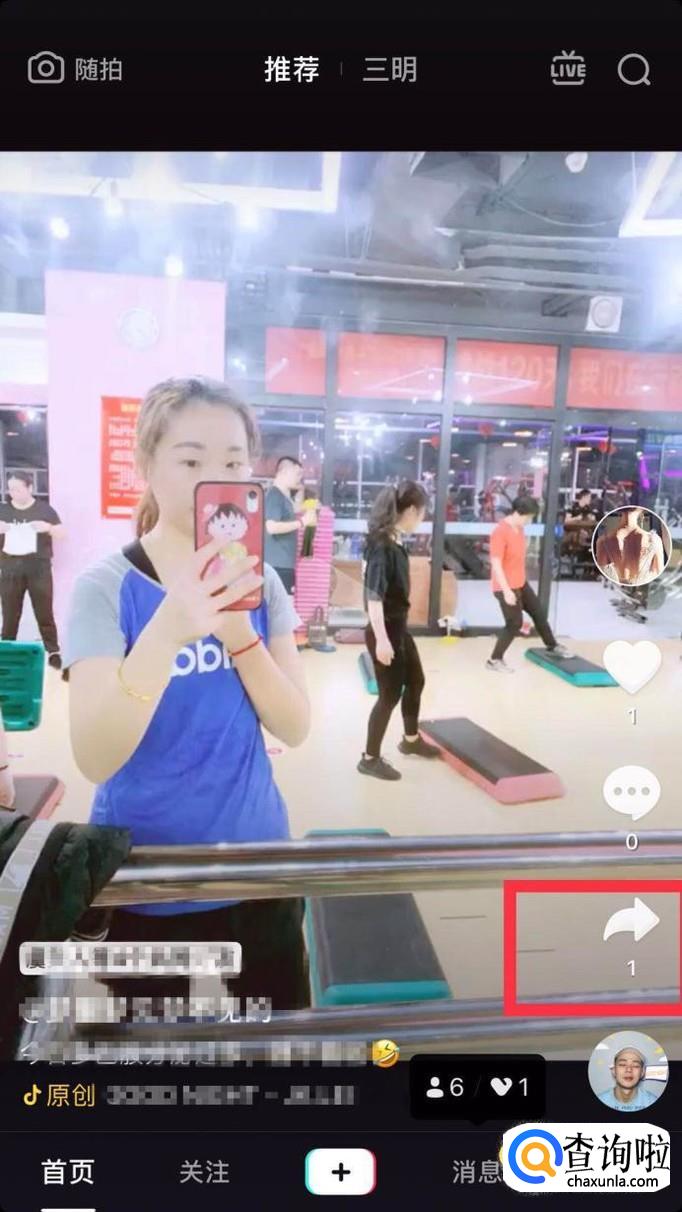 首先在抖音上打开一个我们喜欢的视频并点击右侧的分享图标。