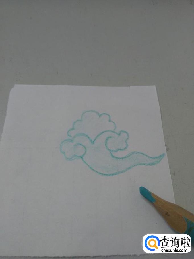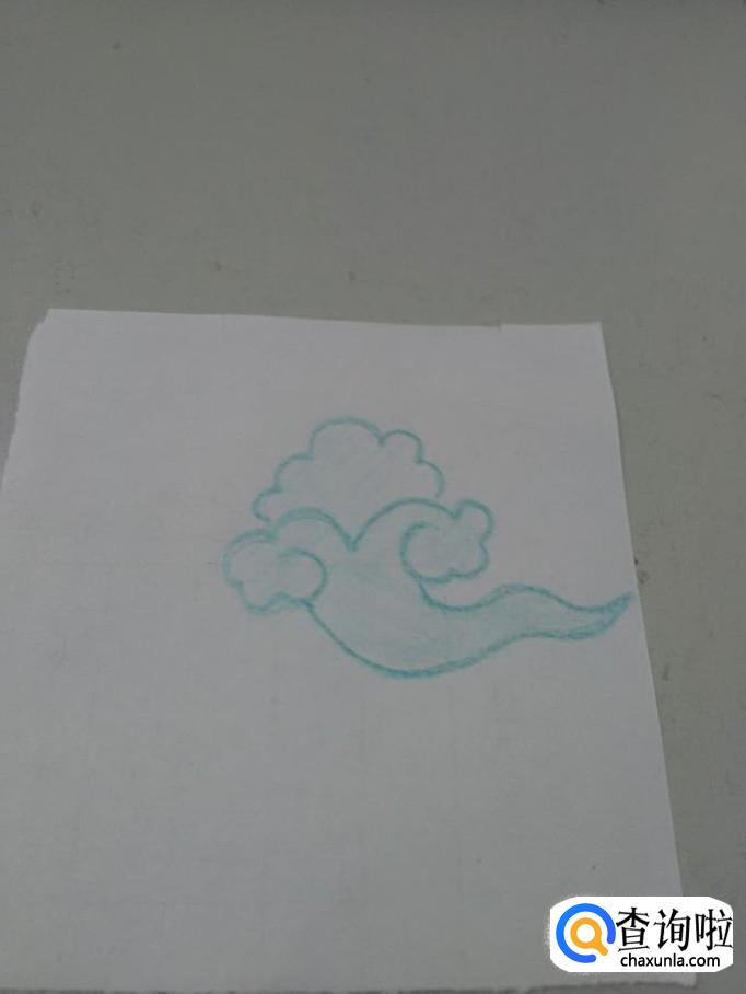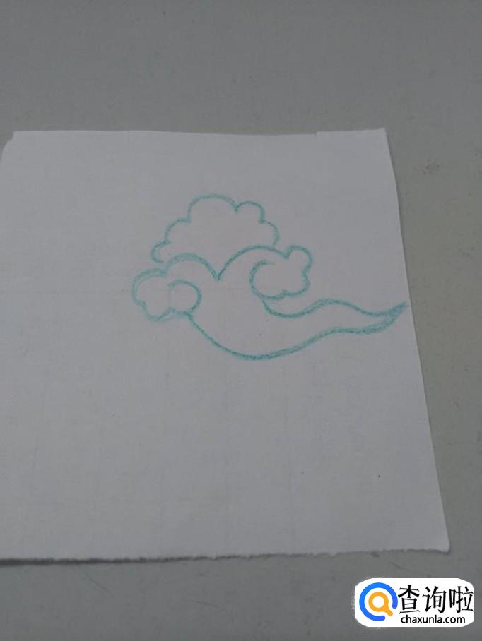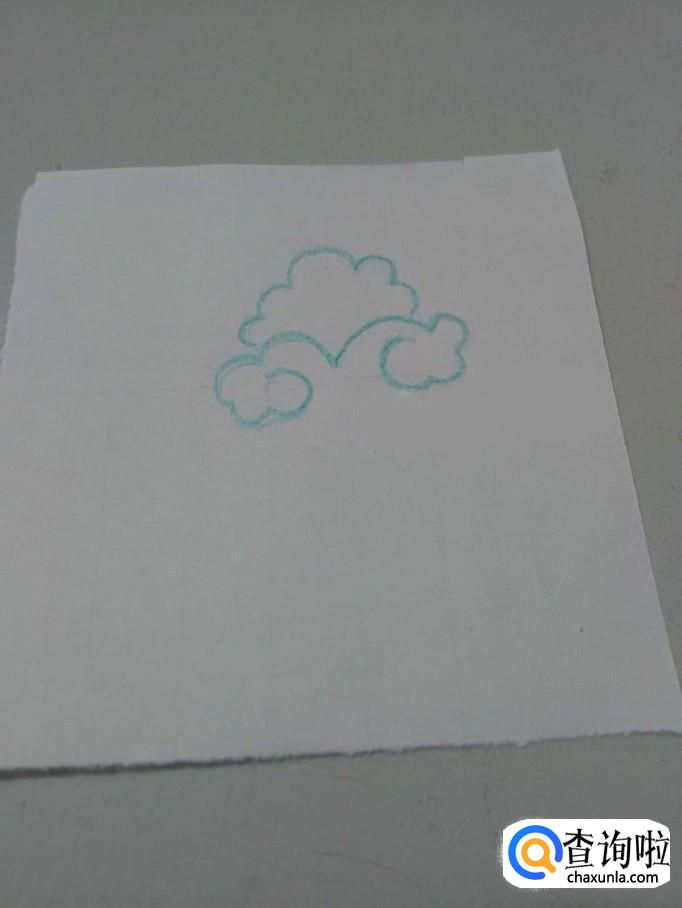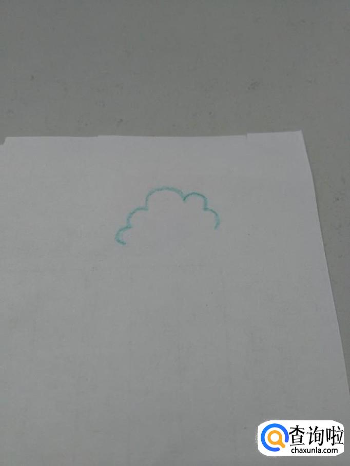 先用彩笔在纸上画五条相连的弧线,中间那一条最长,表示云朵的顶端。