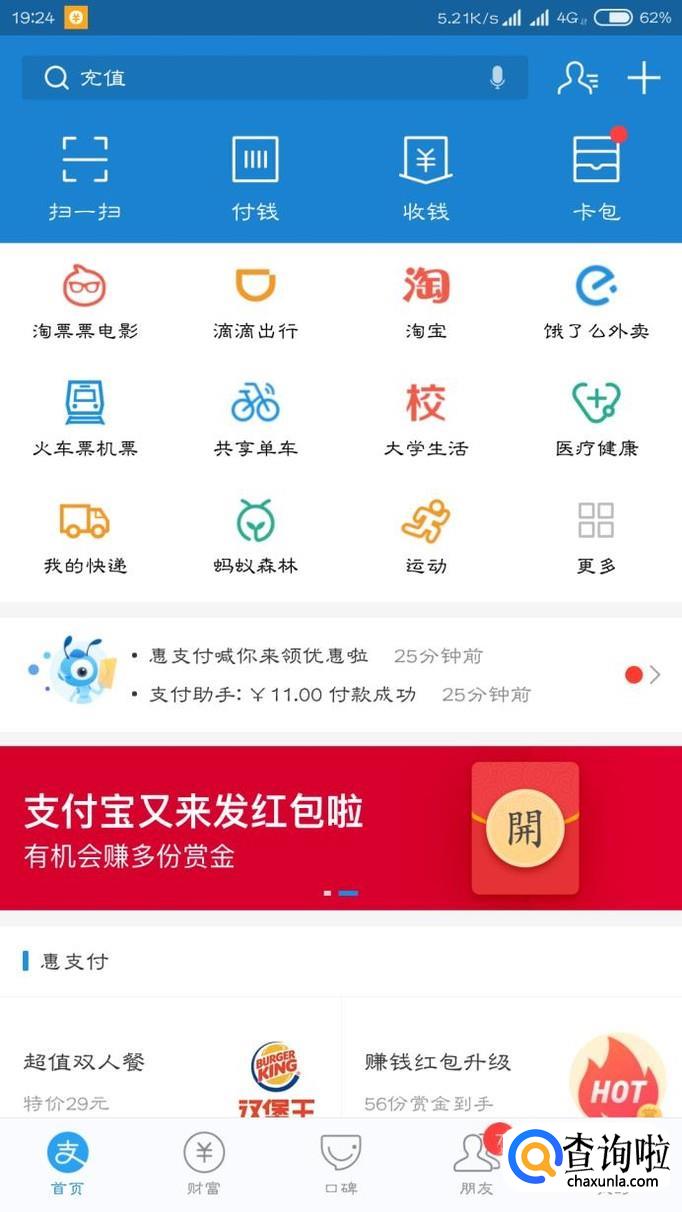 在支付宝的主页面中,拉到下半部分,就可以看到一共红色的条幅,没错,这就是赏金邀请的入口了。