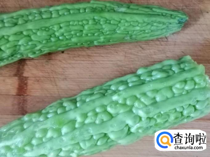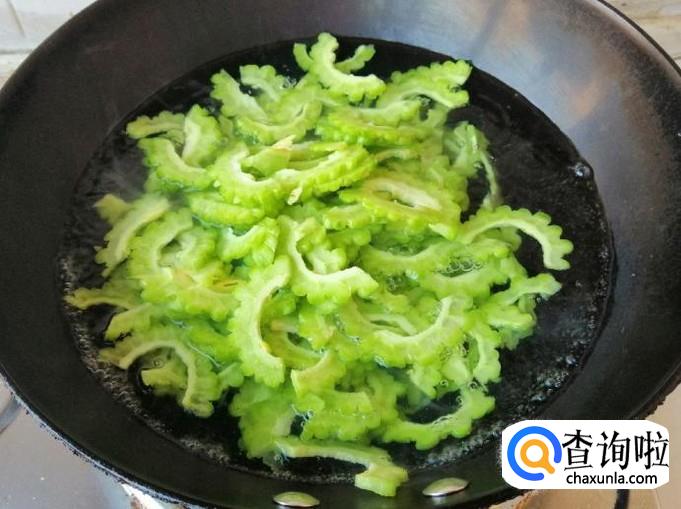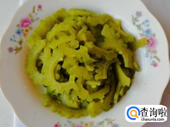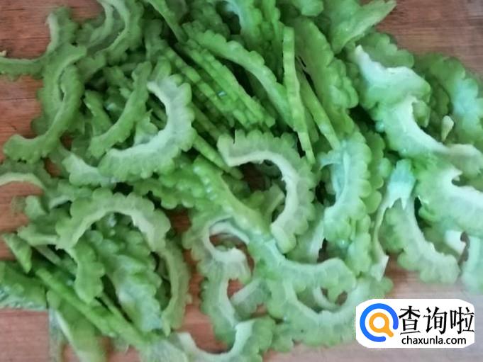 取新鲜的苦瓜,用清水把苦瓜洗净,然后用刀切掉头尾,用勺子挖掉苦瓜瓤和籽,然后把苦瓜切片。锅中烧水,水开后把苦瓜烫熟,大概烫3-5分钟捞出备用。