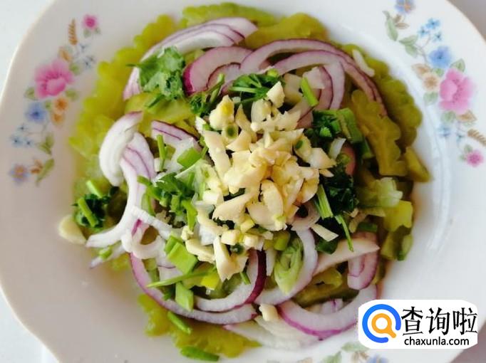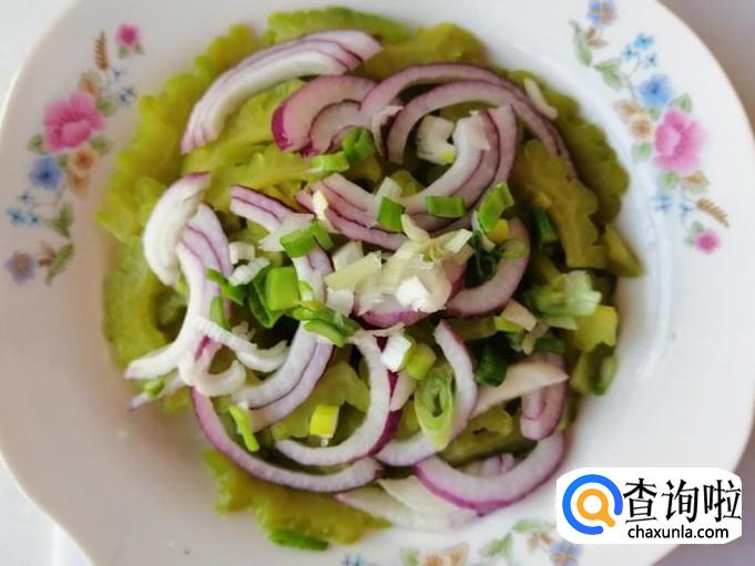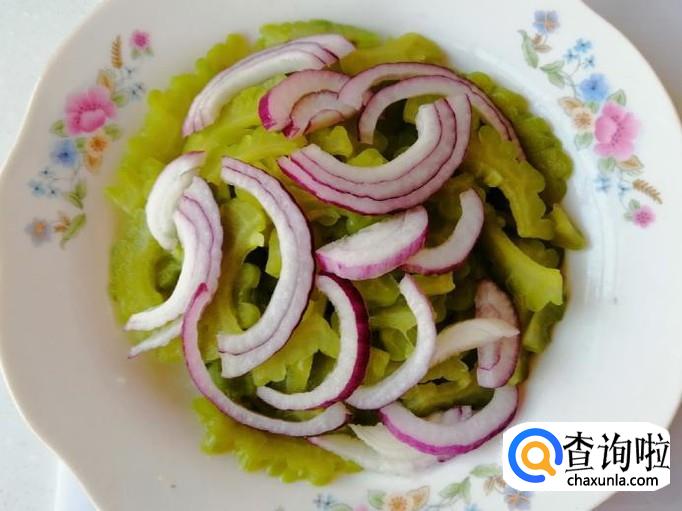 把烫好的苦瓜盘中,加入适量切好的圆葱,加入葱花,再加入切好的香菜,都摆放好待用。